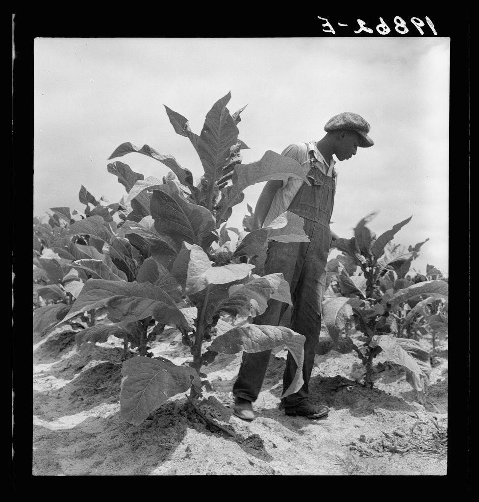 Untitled photo, possibly related to: sharecropper's son goes up and down the long rows worming tobacco.