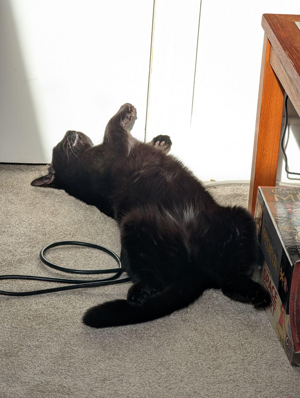 Norbert was so tired after a stressful trip to the vet, he only managed to get one foot out of the bed before falling asleep again