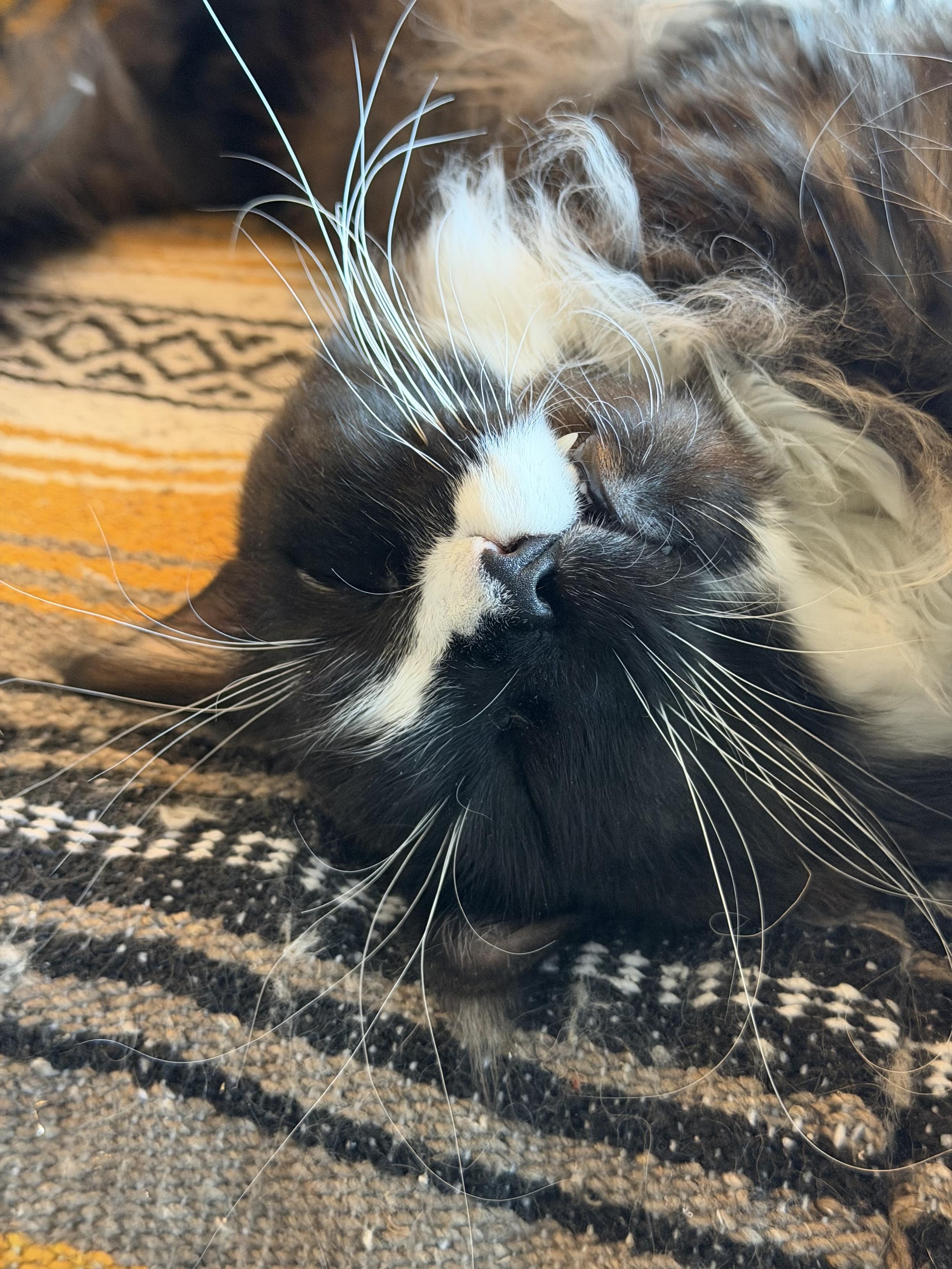 Magnus is having an upside down nap on his chair next to the window, in the winter sun.