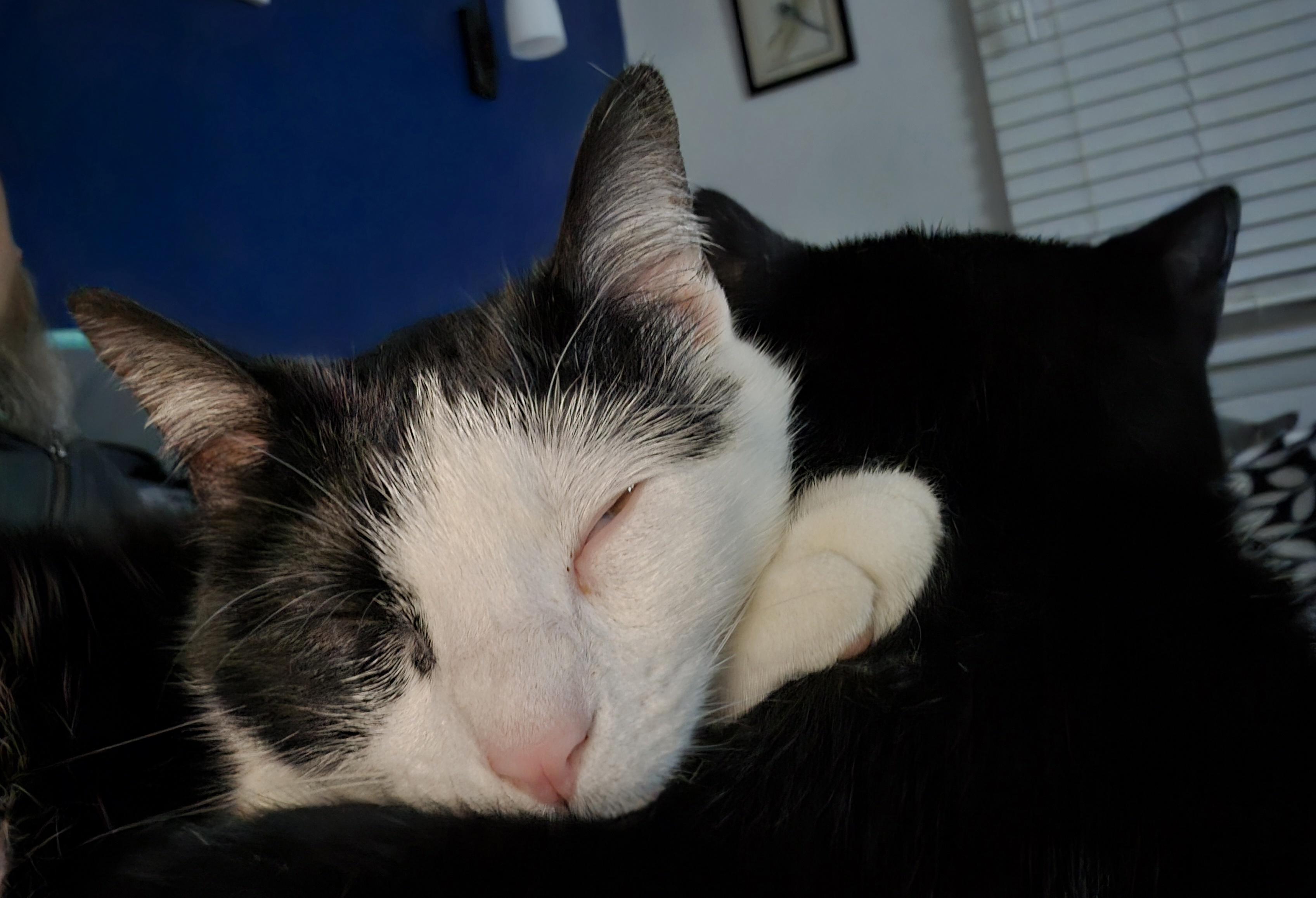 Norbert was so tired after a stressful trip to the vet, he only managed to get one foot out of the bed before falling asleep again
