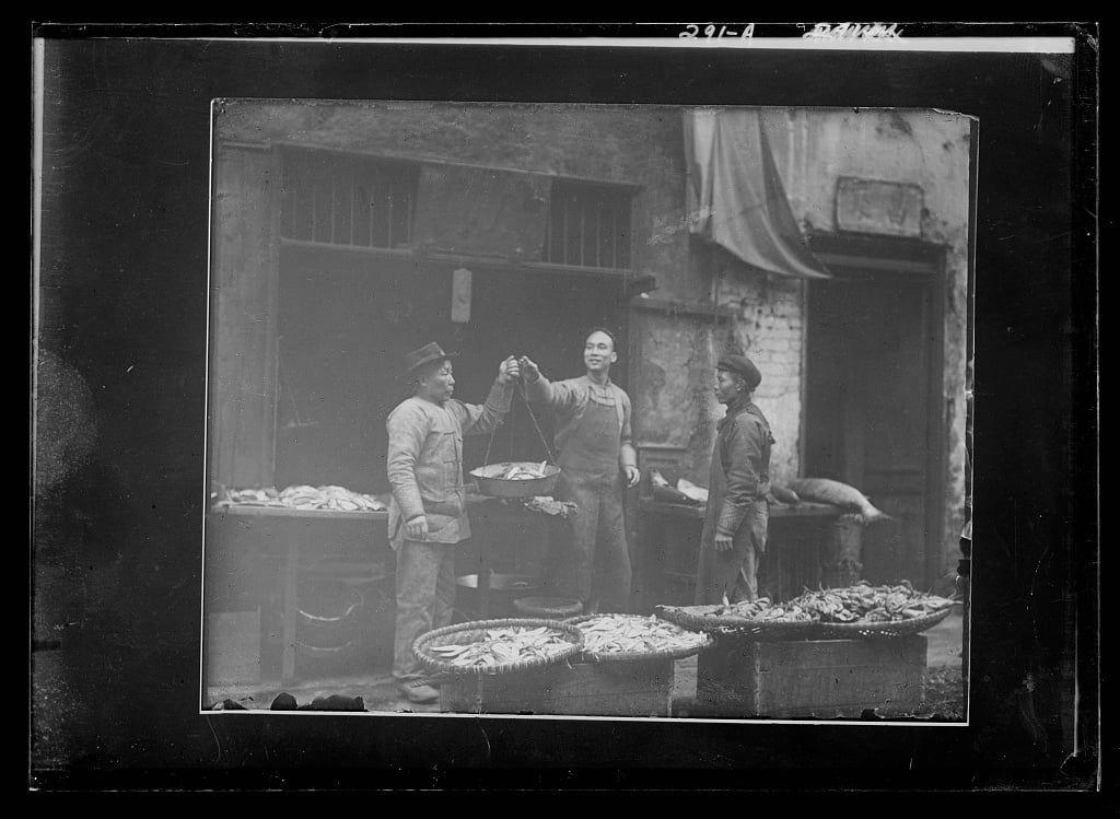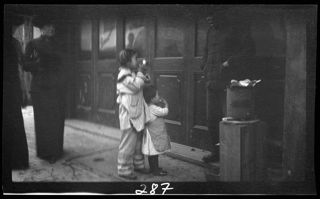 Two children standing on a sidewalk eating, Chinatown, San Francisco between 1896 and 1906