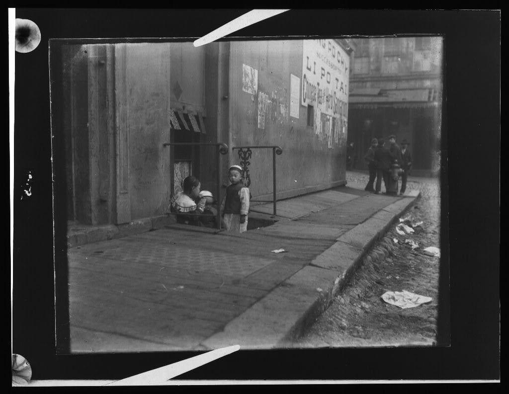 Three children in front of a cellar door, Chinatown, San Francisco between 1896 and 1906