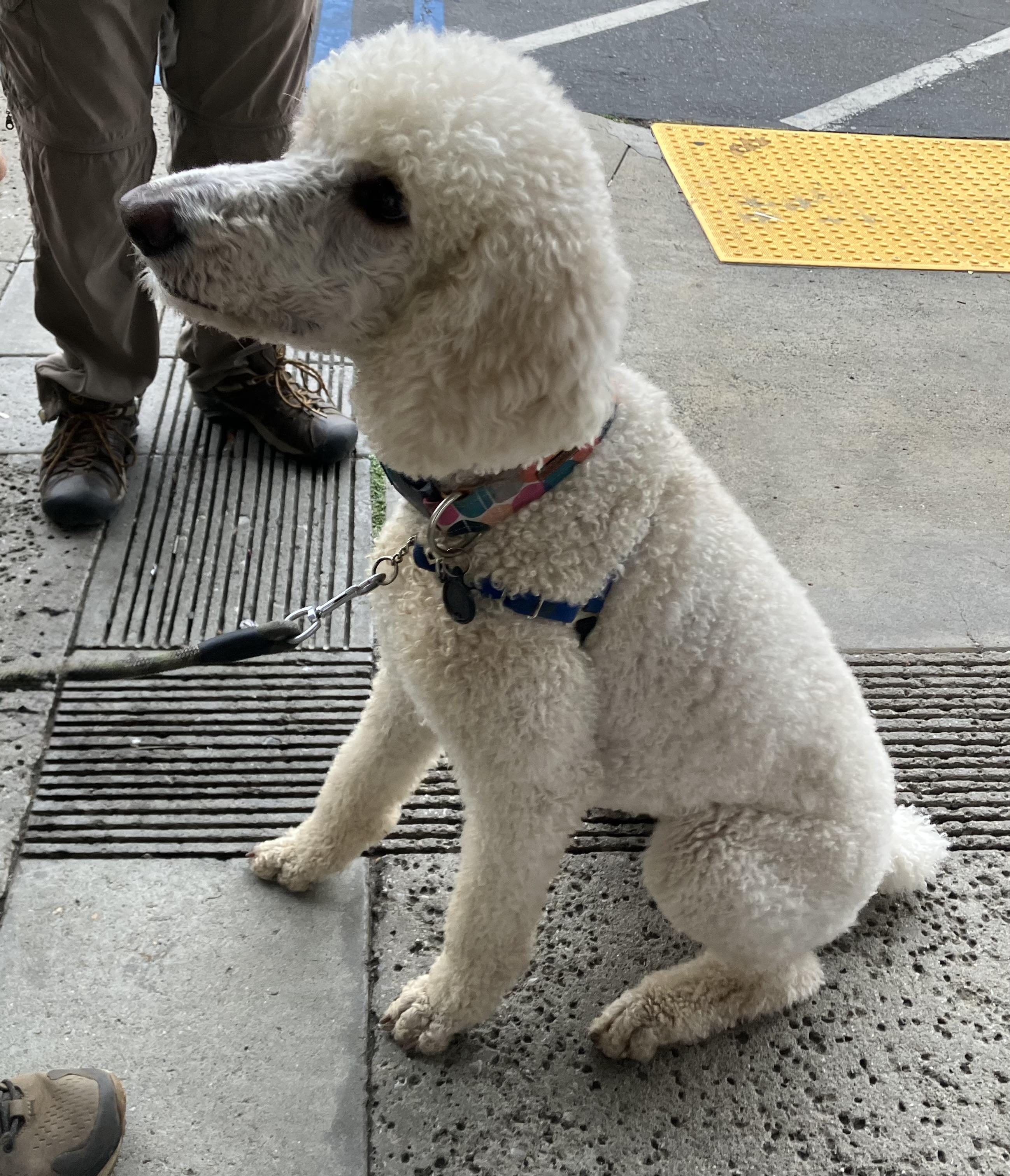 Odin is whining and howling because mommy let a perfectly good tram come and go without getting on board.