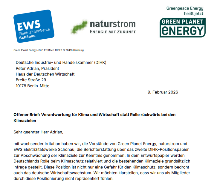 Gemeinsam mit @GreenPlanet_nrg und @NATURSTROM widersprechen wir in einem offenen Brief den Forderungen der Deutschen Industrie- und Handelskammer (DIHK), die deutschen Klimaziele aufzuweichen.