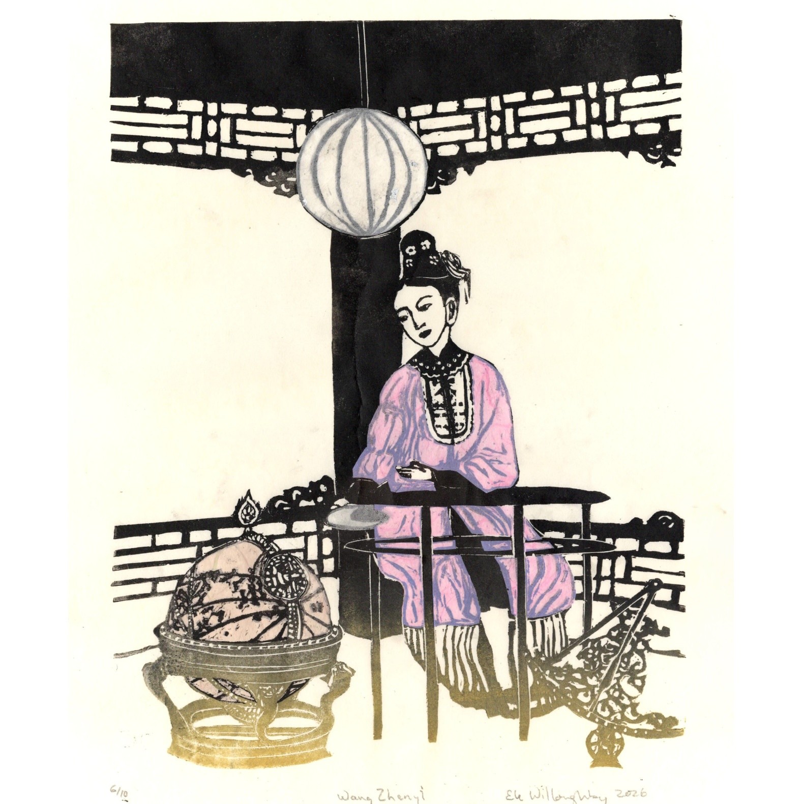 My final #PrinterSolstice2526 #linocut for the prompt multiplication: astronomer, mathematician, meteorologist & poet Wang Zhenyi (1768-1797), who left her impact on Qing era China during her short life.