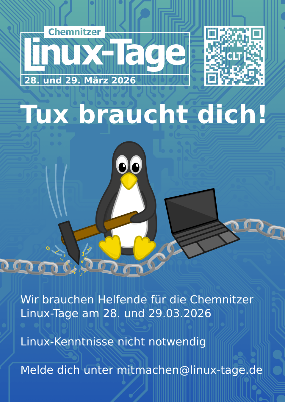 Damit es in knapp einem Monat wieder tolle Chemnitzer Linux-Tage für alle werden, benötigen wir noch ein paar fleißige helfende Hände, bspw.