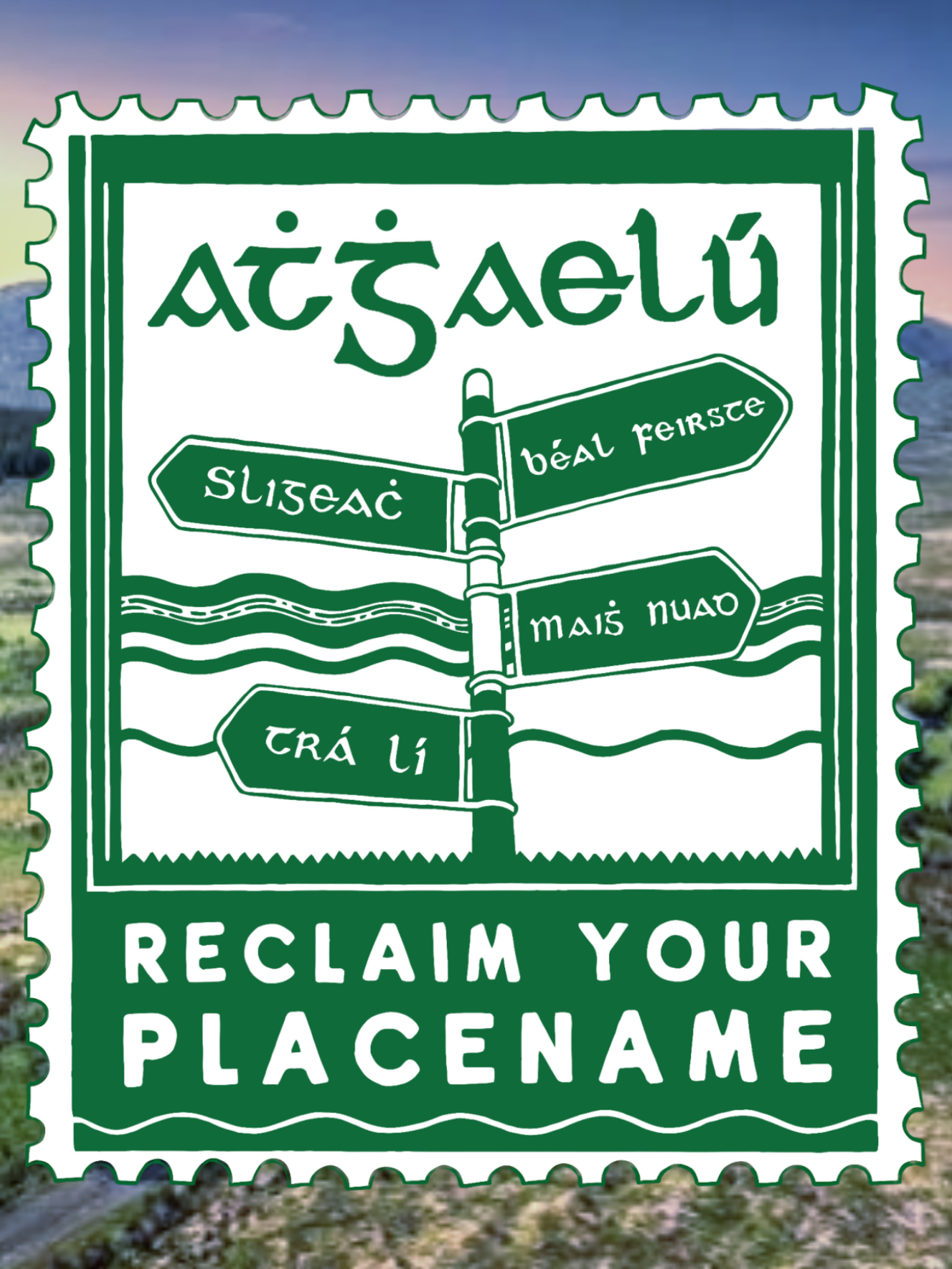 Stamp doodle logo for the Conradh na Gaeilge AthGhaelú campaign "to encourage people to use Irish placenames instead of English placenames in all aspects of life."