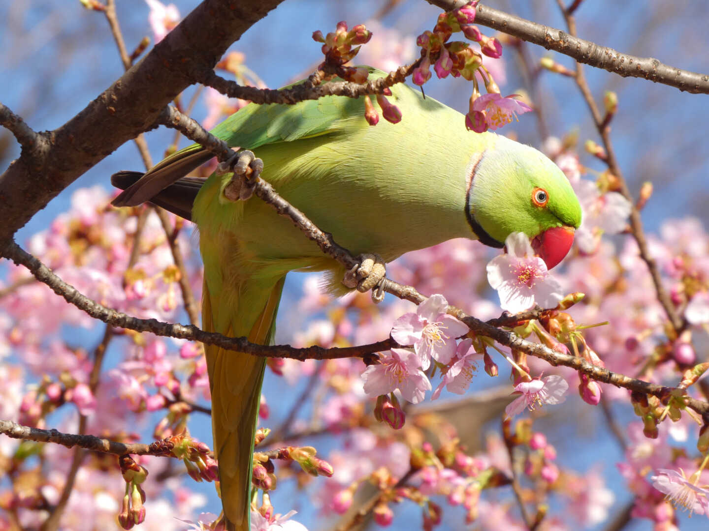 the rose-ringed parakeets (Psittacula krameri) came to a Kawazu cherry blossom tree to eat its flowers (4 photos) #bird #bloomscrolling #nature