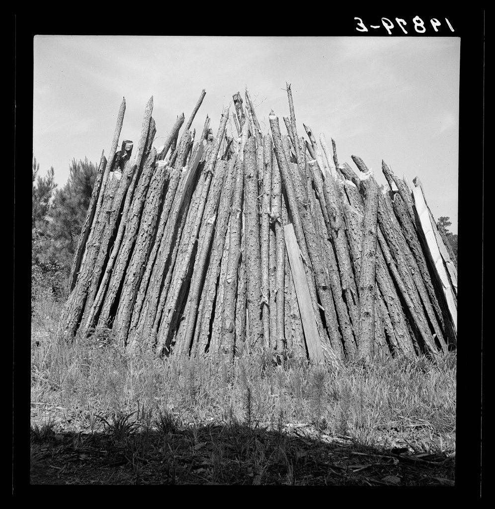 Untitled photo, possibly related to: The old tobacco barn (new one under construction.) Note logs stacked in pile on left for firing and curing tobacco.
