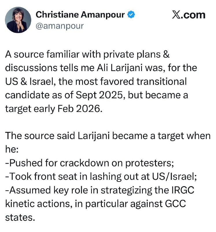 Käännös CNN:n ulkoministeriön hakkerin Christiane Amanpourin puheesta Hasbaran kielelle: #Trump perusteli Ali Larijanin tappamista sillä, että he toivoivat hänen olevan maansa petturi, ja kävi ilmi