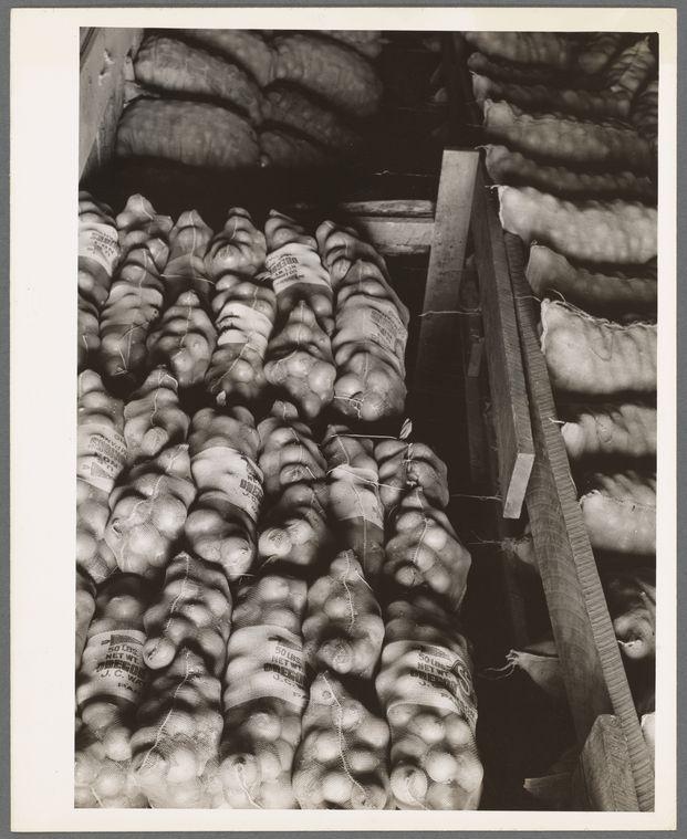 Fifty-pound bags of onions in storage shed, ready for market.