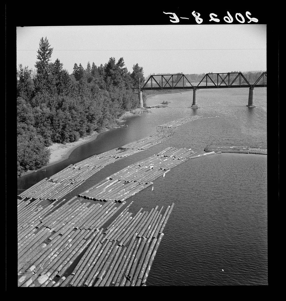 Log rafts on the Williamette River between Salem and Independence, Oregon