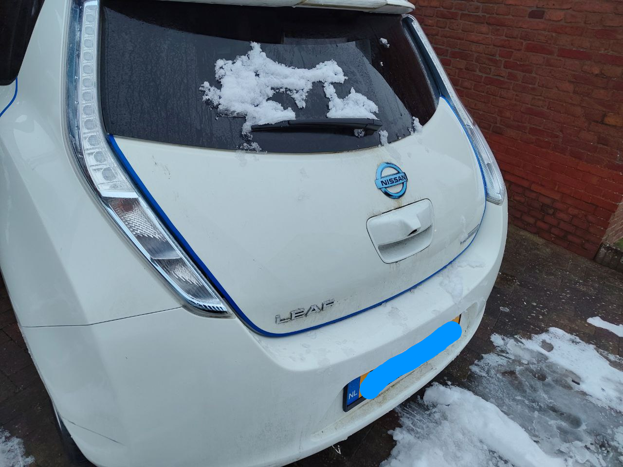 But it actually looks kinda cool, the dark blue contrasts nicely against the otherwise white car (2013 Nissan Leaf)