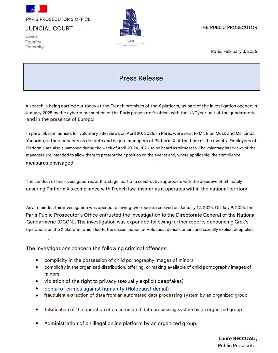 The Paris prosectors' office posted that statement onto LinkedIn here: https://www.linkedin.com/feed/update/urn:li:activity:7424403936779952128/