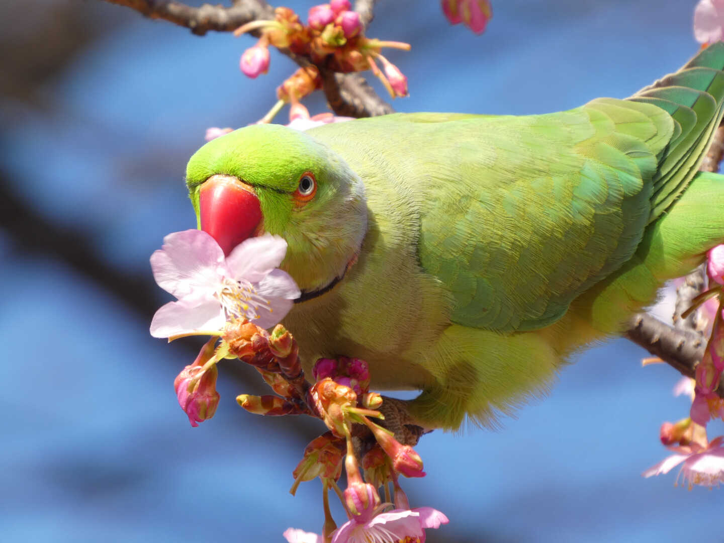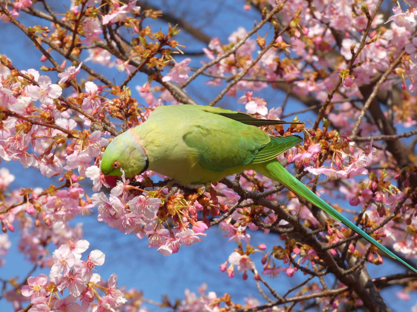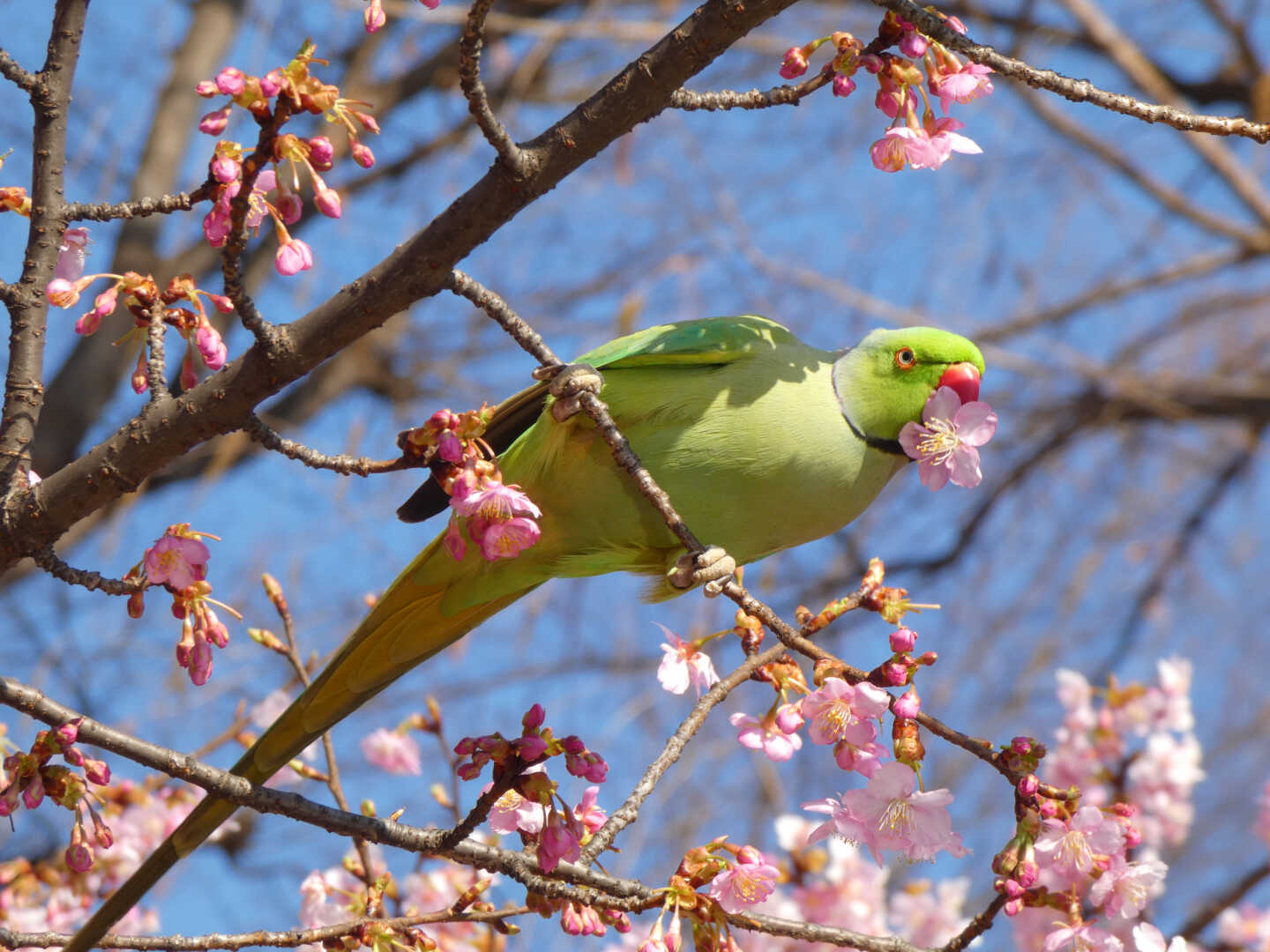 the rose-ringed parakeets (Psittacula krameri) came to a Kawazu cherry blossom tree to eat its flowers (4 photos) #bird #bloomscrolling #nature