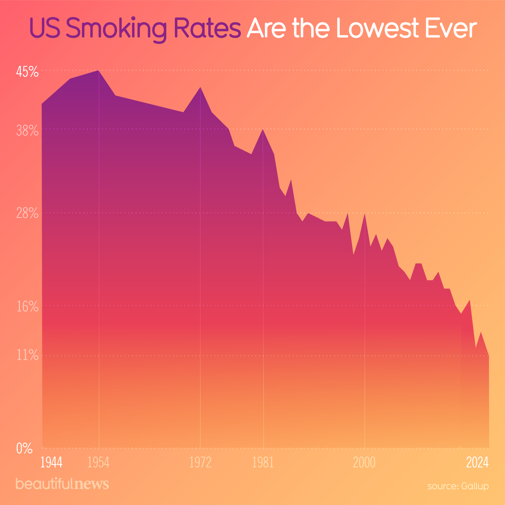 Smoking in the USA has reached an historical low. It’s now 11% (vs 45% in the 1950s). For people under 30s, it’s just 6% (vs 35% in the early 2000s)