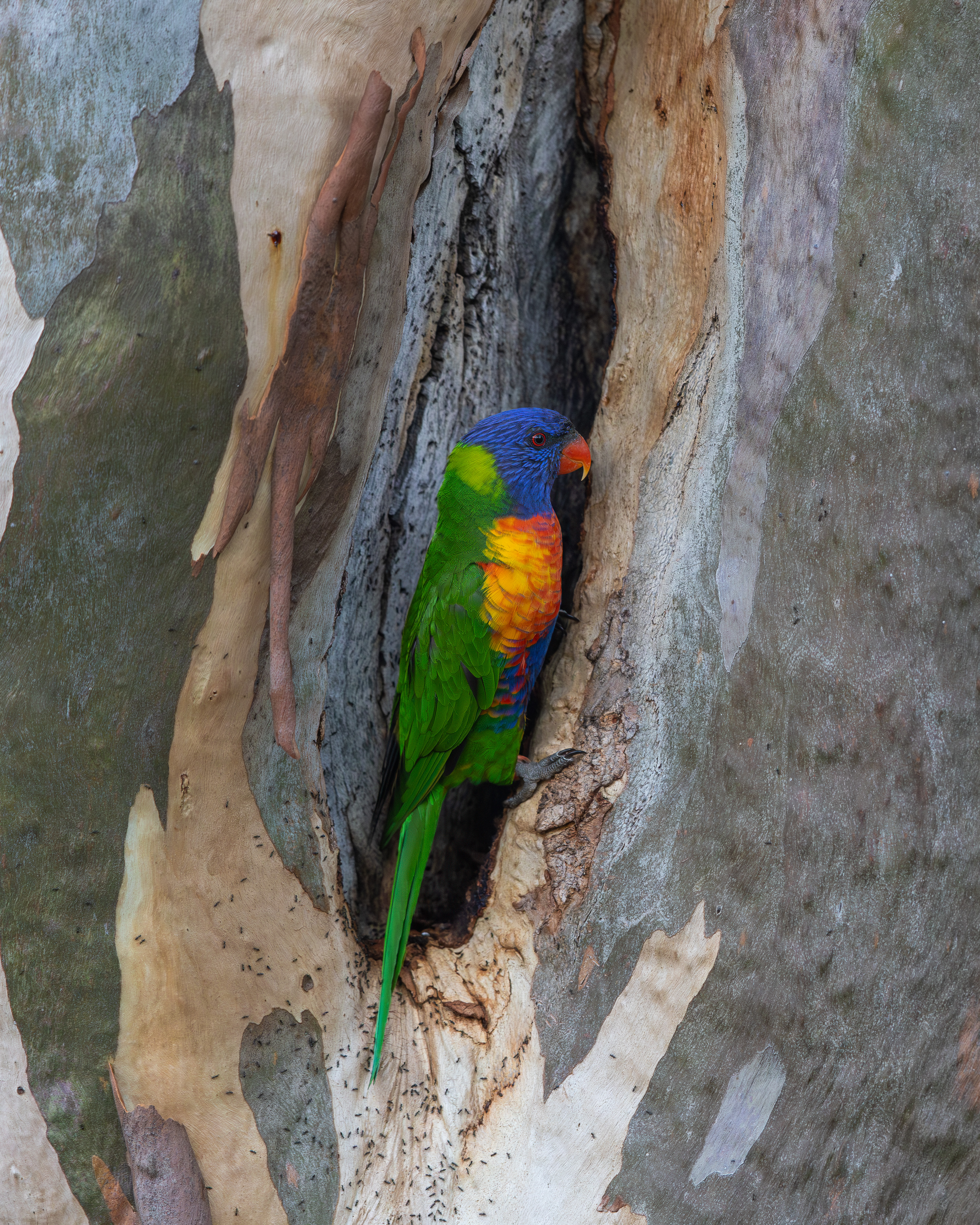heute waren wir zum Sonnenuntergang am Lake Bibra und haben dort Regenbogenloris kurz vor dem zu Bett gehen an ihrem Schlafbaum beobachtet. Die zwei wohnen oben in der Höhle und der Lori von Bild zwei in dem Schlitz, eine Etage tiefer. Aber auch mit einem anderen Lori zusammen.