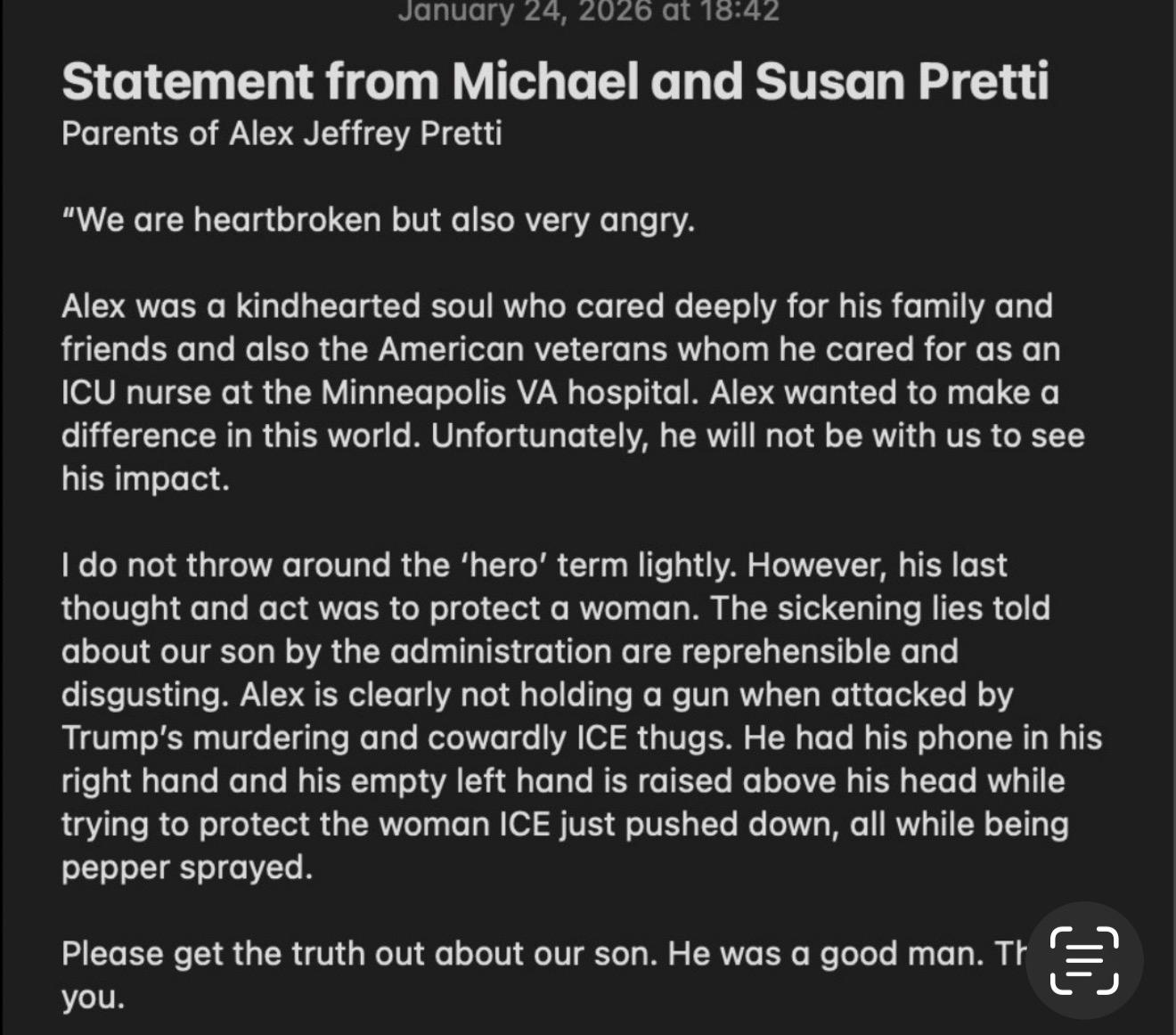 Alex’s parents: “Alex is clearly not holding a gun when attacked by Trump’s murdering and cowardly ICE thugs… Please get the truth out about our son.”