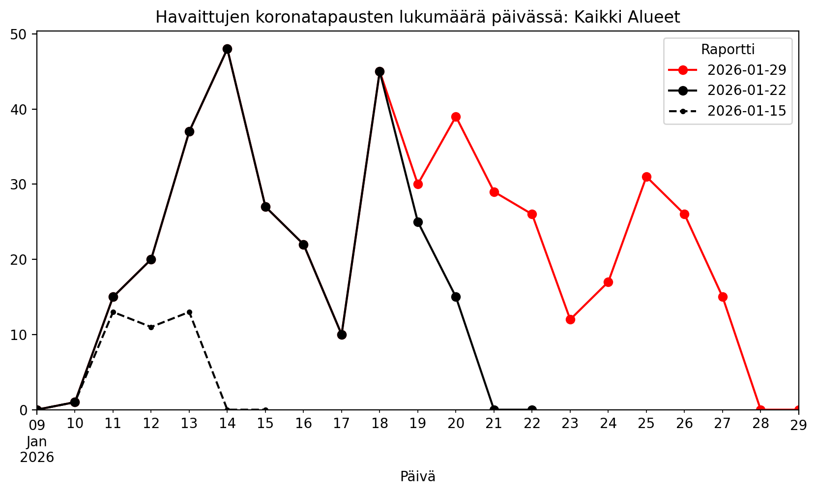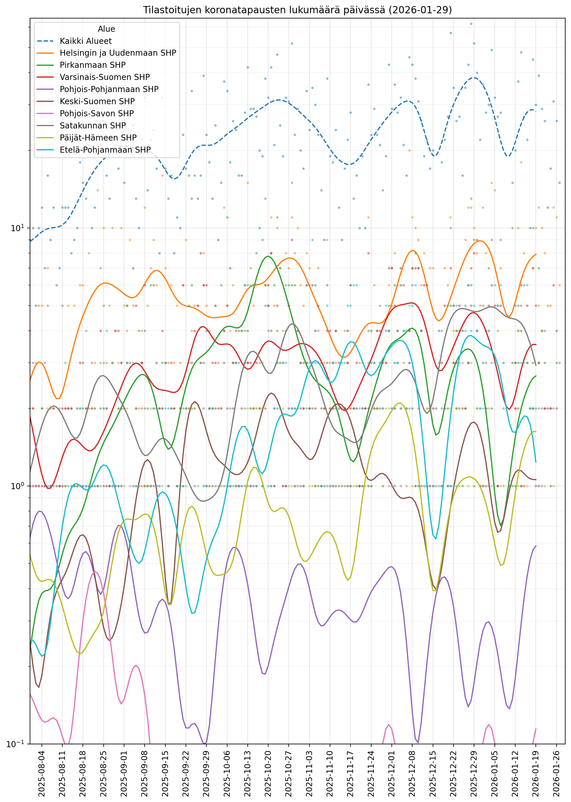 Koronatapaukset ja koronan takia alkaneet vuodeosastojaksot, tällä viikolla (5/2026) julkaistu data.