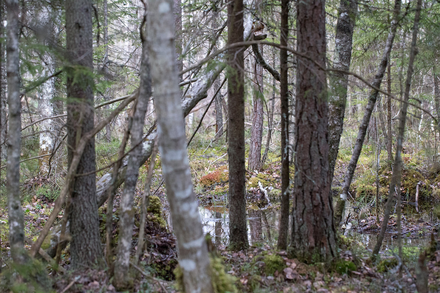 Järeää lehtilahopuuta oli pötköllään viime keväänä lähteikön reunassa Uudenmaan puolella. Jotakuinkin tähän on merkitty rakennettavaksi uusi voimalinja Inkoon suuntaan.