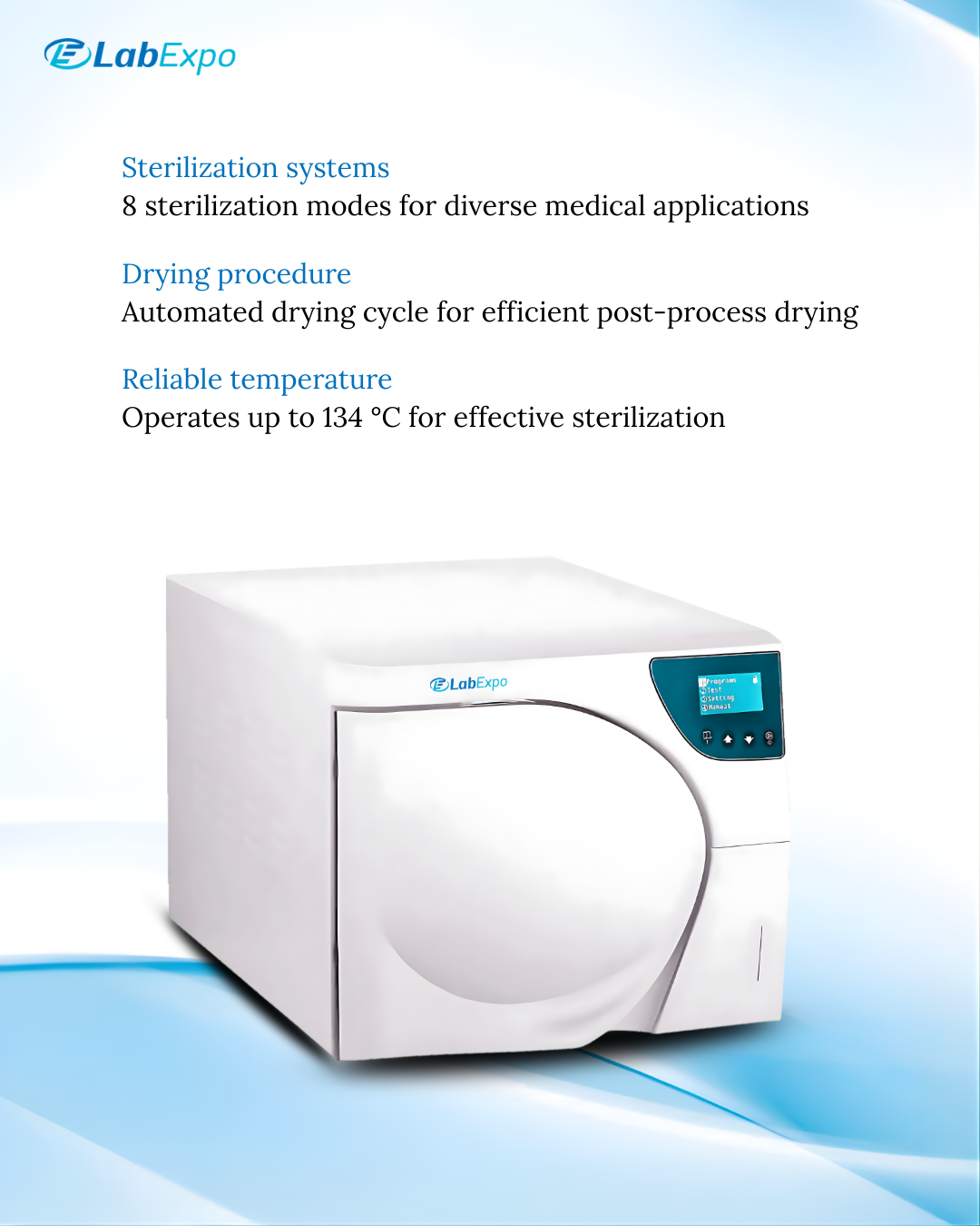 Lab Expo Medical Autoclave is a Class B fractionated unit with 8 sterilization programs and 2 test modes, PC monitored. Automatic overheat shutdown, low-water alarm, and power/water cut-off enhance safety. Designed for clinics and labs needing fast, consistent cycles and easy control.
