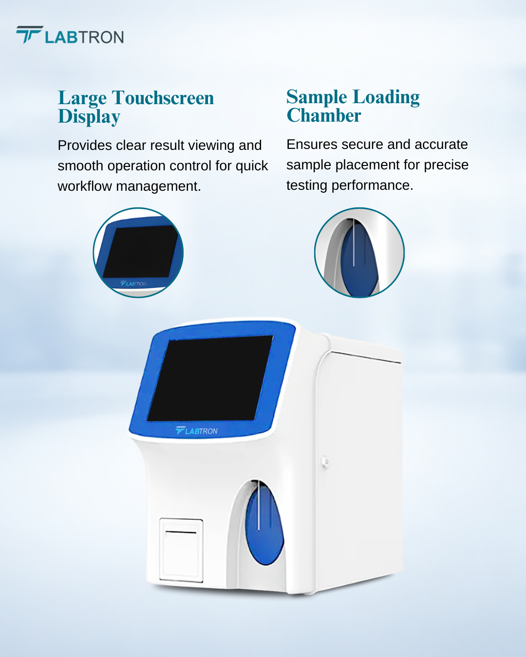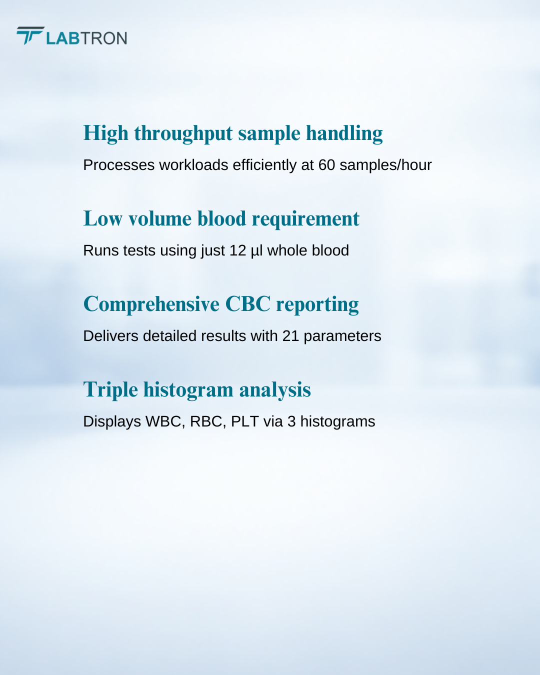 Labtron Hematology Analyzer processes 60 samples/hour using 12 µl whole blood or 20 µl pre-diluted samples for efficient workflow. It delivers 21 parameters with 3 histograms on a 9.7-inch color touch LCD. Auto-cleaning system and cyanide-free HGB detection support safe, precise analysis.