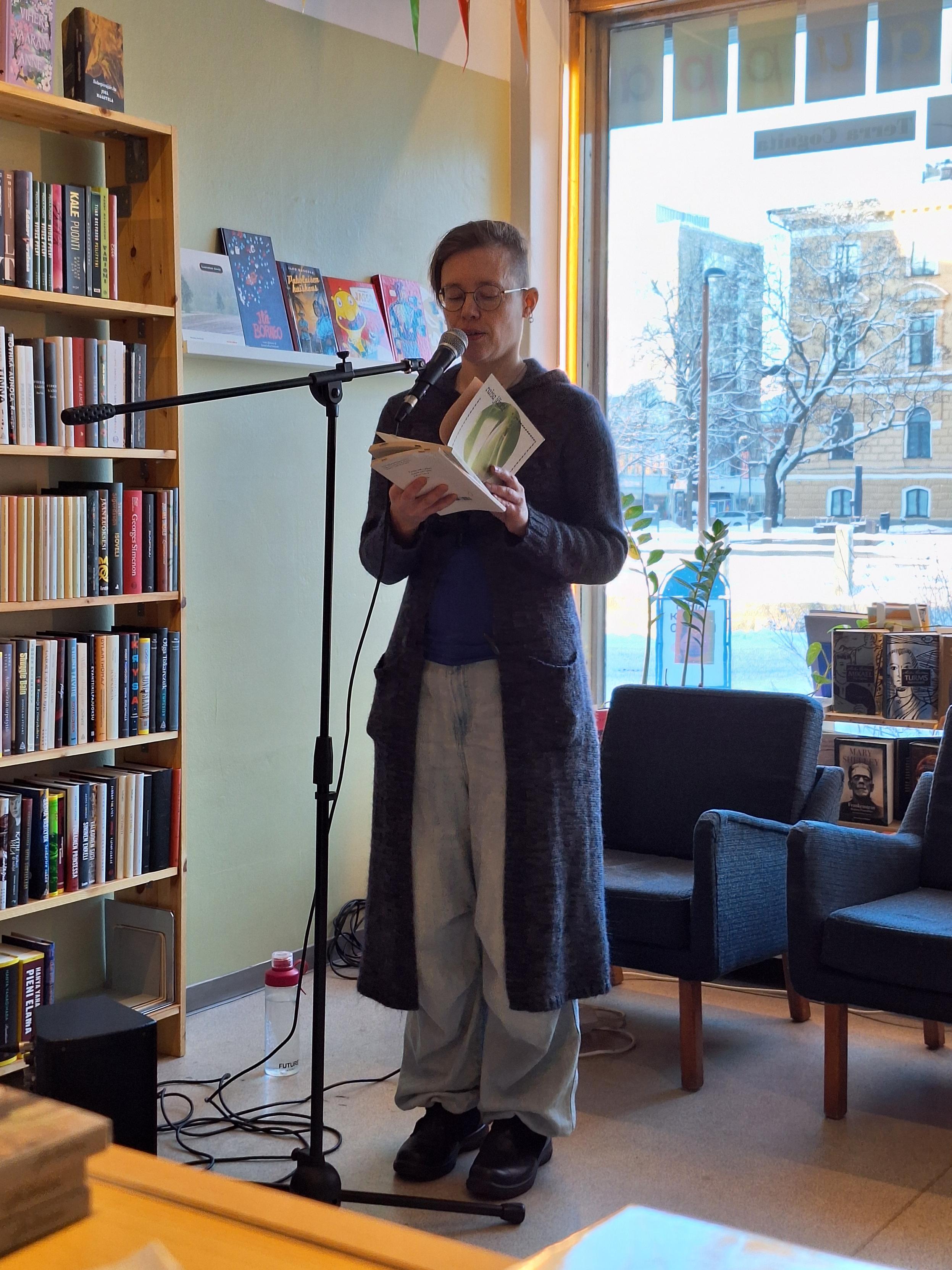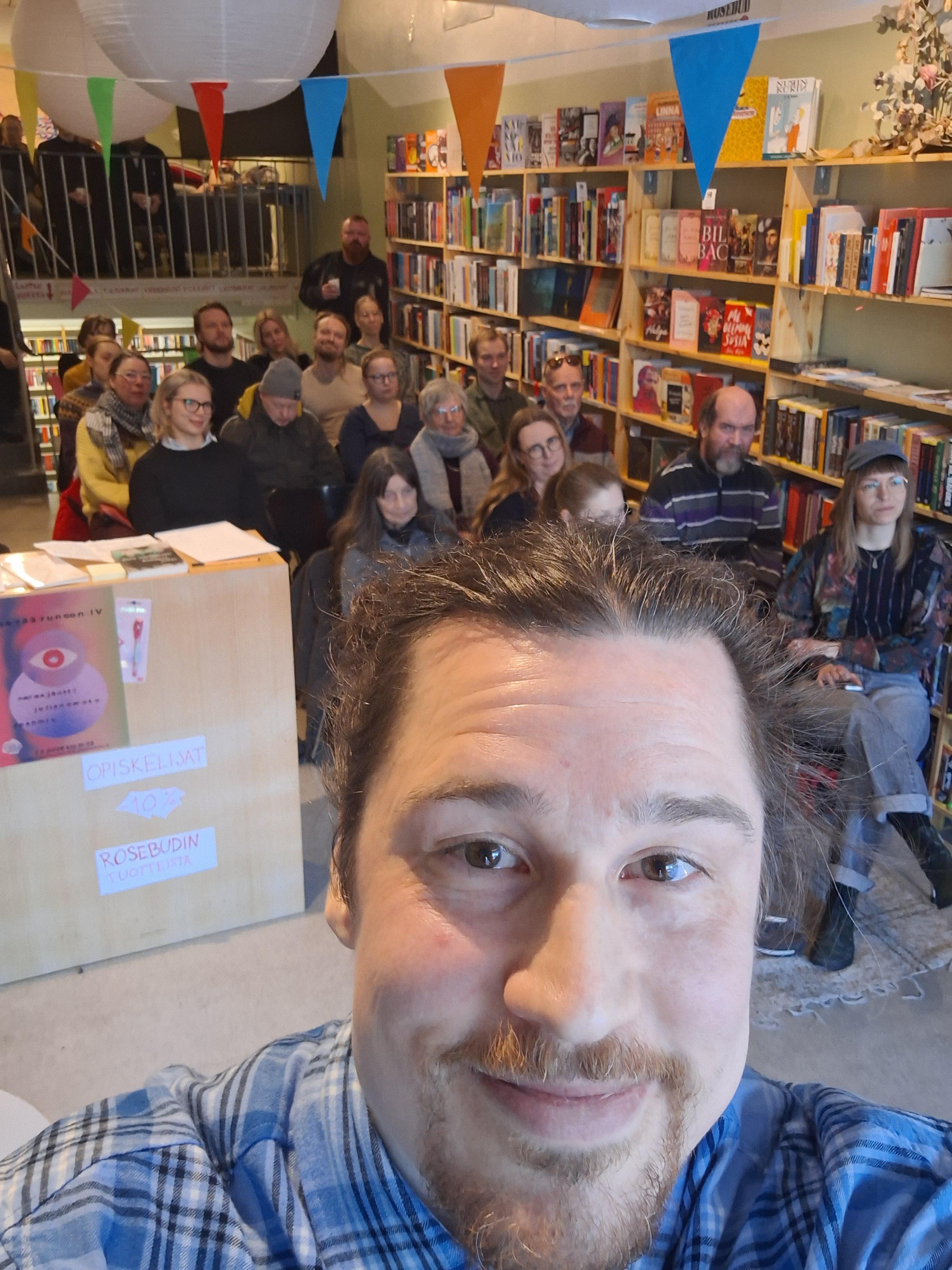 Herää runoon IV on tapahdutettu! Iso kiitos yleisöön saapuneille ja open miciin uskaltautuneille sekä etenkin upeille kutsuvierasesiintyjillemme Julian Owusulle ja Raisa Jäntille! Julianin ja Raisa esityksissä kuljettiin mm. vallankumouksellisissa ja kehollisissa tunnelmissa sekä rankoin että keventävin painotuksin ja openmicittäjien vedoissa kuultiin hienon vaihtelevaa sanataidetta. Tunnelma oli yleisestikin ottaen todella lämmin Oulun kirjallisuuden talolla, minne palasimme yhden Pop-up Klonkassa juhlitun Herää runoon -klubin jälkeen ja taisi juuri täyttyä jokainen tuoli niin ettei kukaan joutunut seisomaan. Järjestäjä-Vartiainen kiittää ja kumartaa koko järkkäriporukan puolesta. Herää runoon -aamurunoklubi taustalla toimii siis neljä Oulun kirjailijanseuran jäsentä: allekirjoittanut Jere Vartiainen sekä Katri Rauankoski, Timo Juntunen ja Lauri Ahtinen.