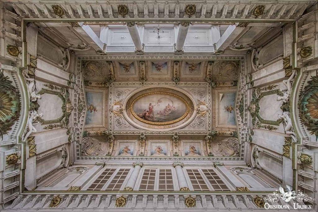 A grand abandoned spa in Belgium. The exquisite architecture is inspired by French Neo-Renaissance and Italian architecture, featuring lavishly painted ceilings and decorated marble columns.