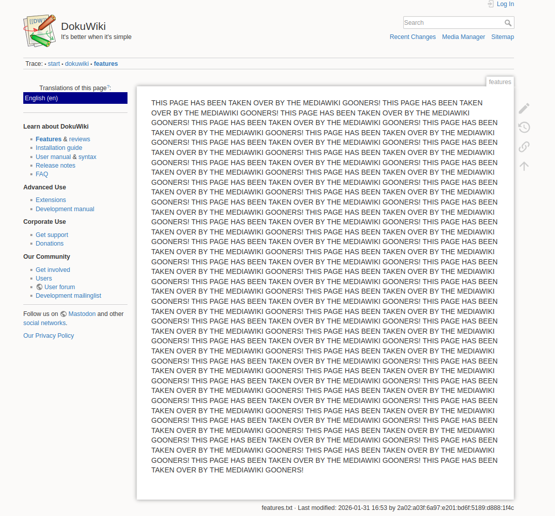 @puppygirlhornypost2 @dokuwiki FYI someone defaced https://www.dokuwiki.org/features
