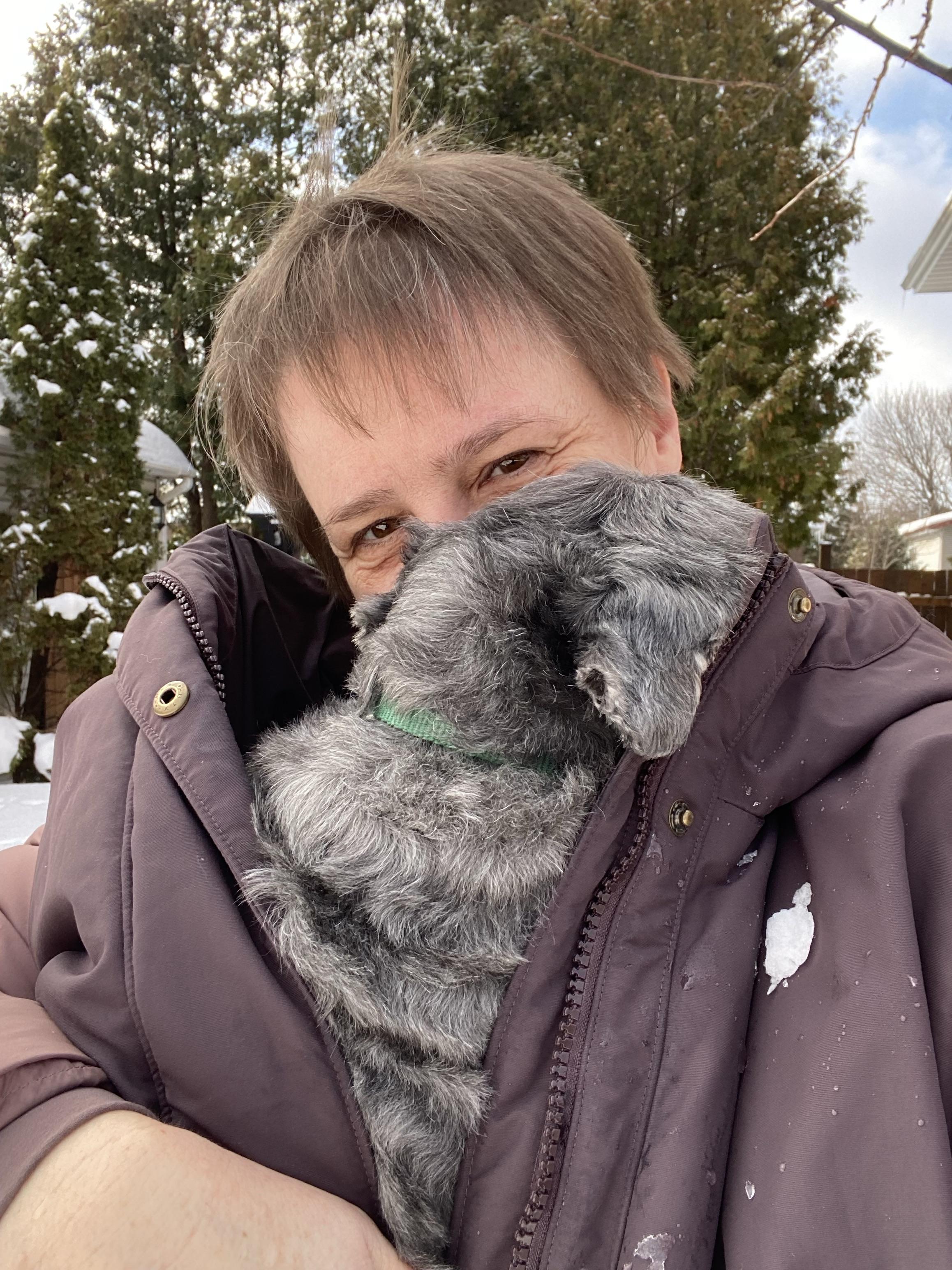 He was getting cold in the snow, so I picked him up and warmed him in my coat. He buried his nose in my neck.