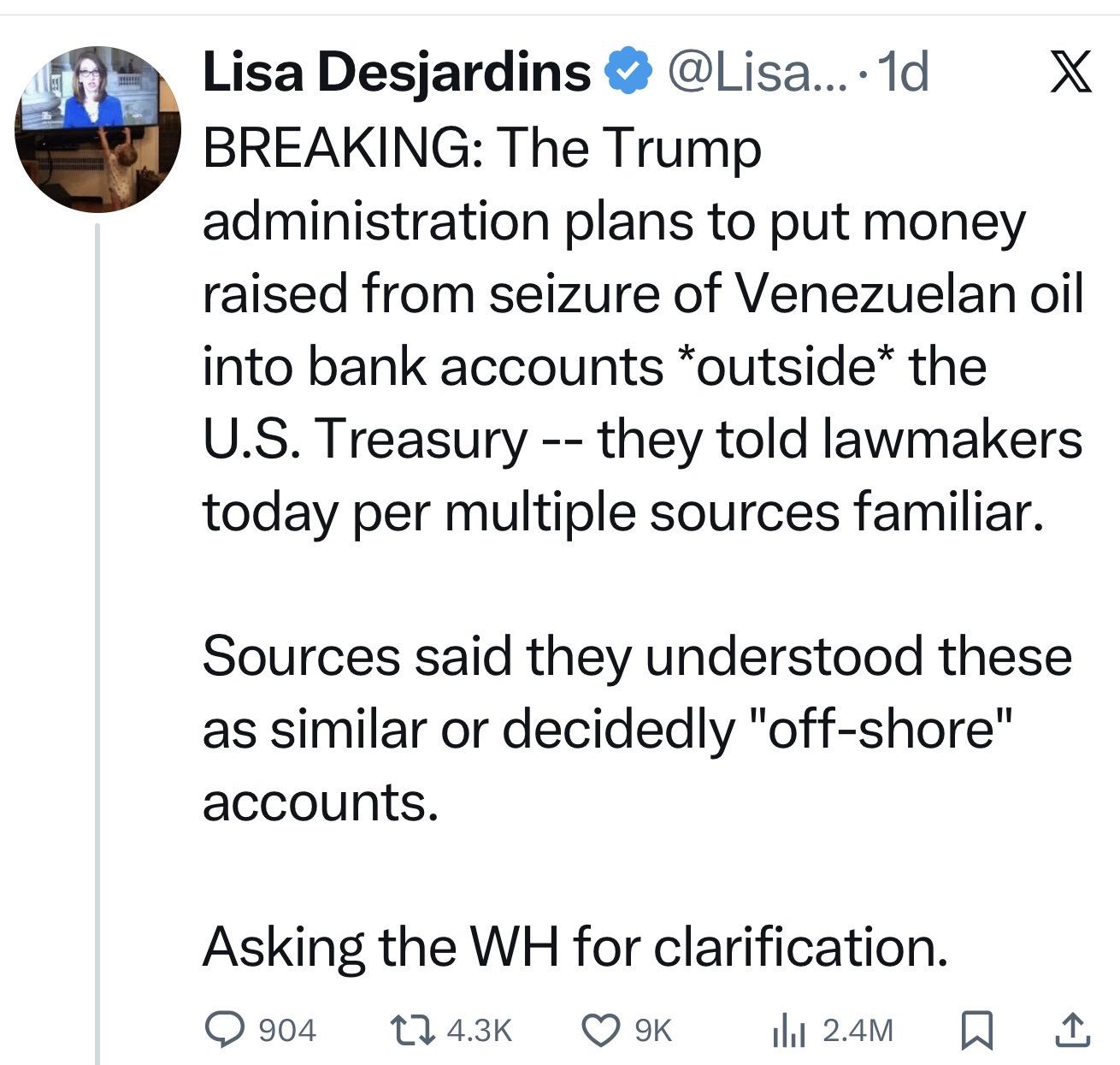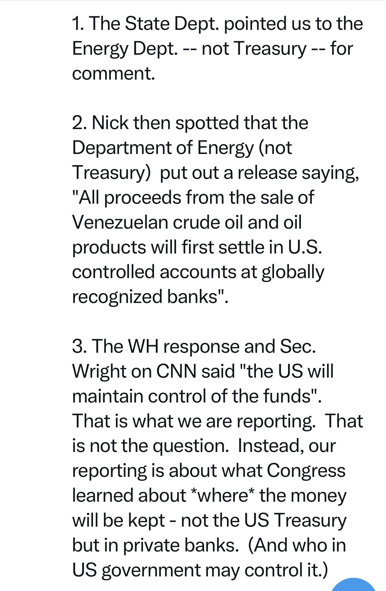 Translation: foreign oil sold at market prices, proceeds parked in U.S.-controlled private bank accounts, not the Treasury, outside Congress’s budget process.