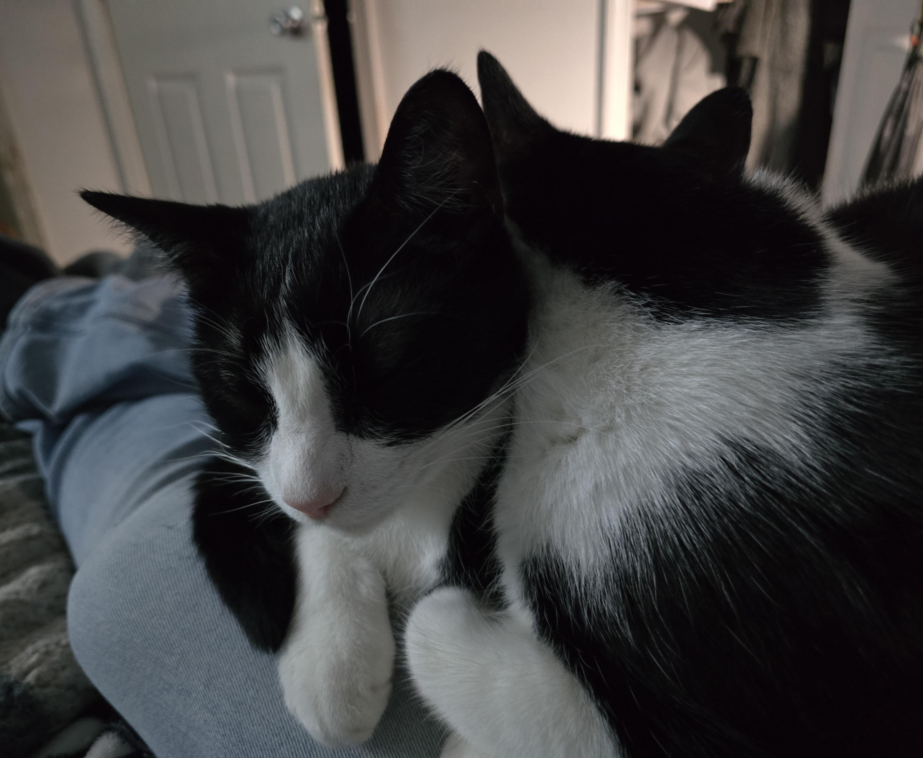 The cats are keeping my lap warm this evening. Oreo and Penguin have been spending a lot of time together lately.