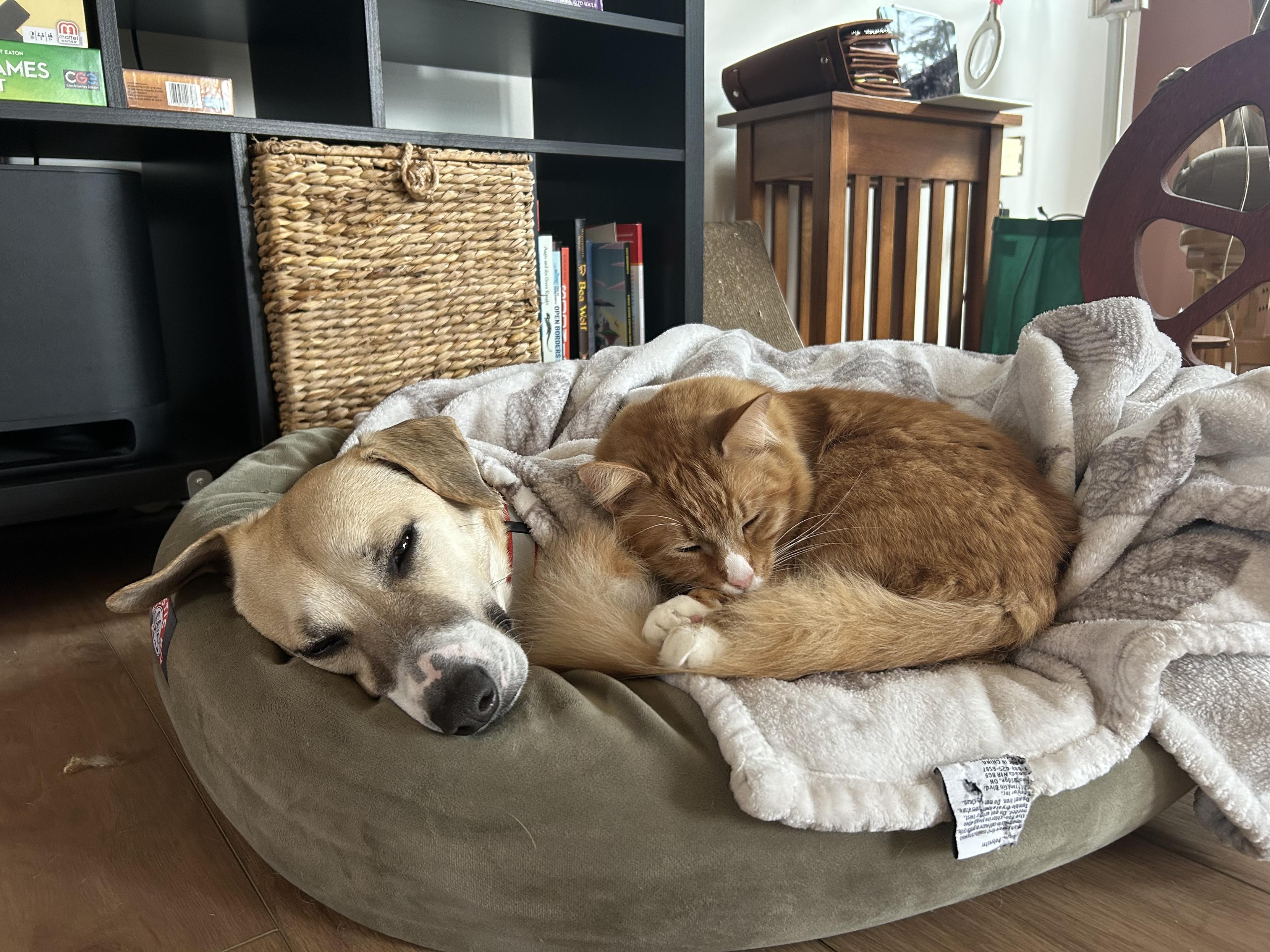 The boys having a Sunday snooze. Sir Wobbles finds Radar to be a good friend… or at least a good pillow. #catsofmastodon #cats #dogsofmastodon