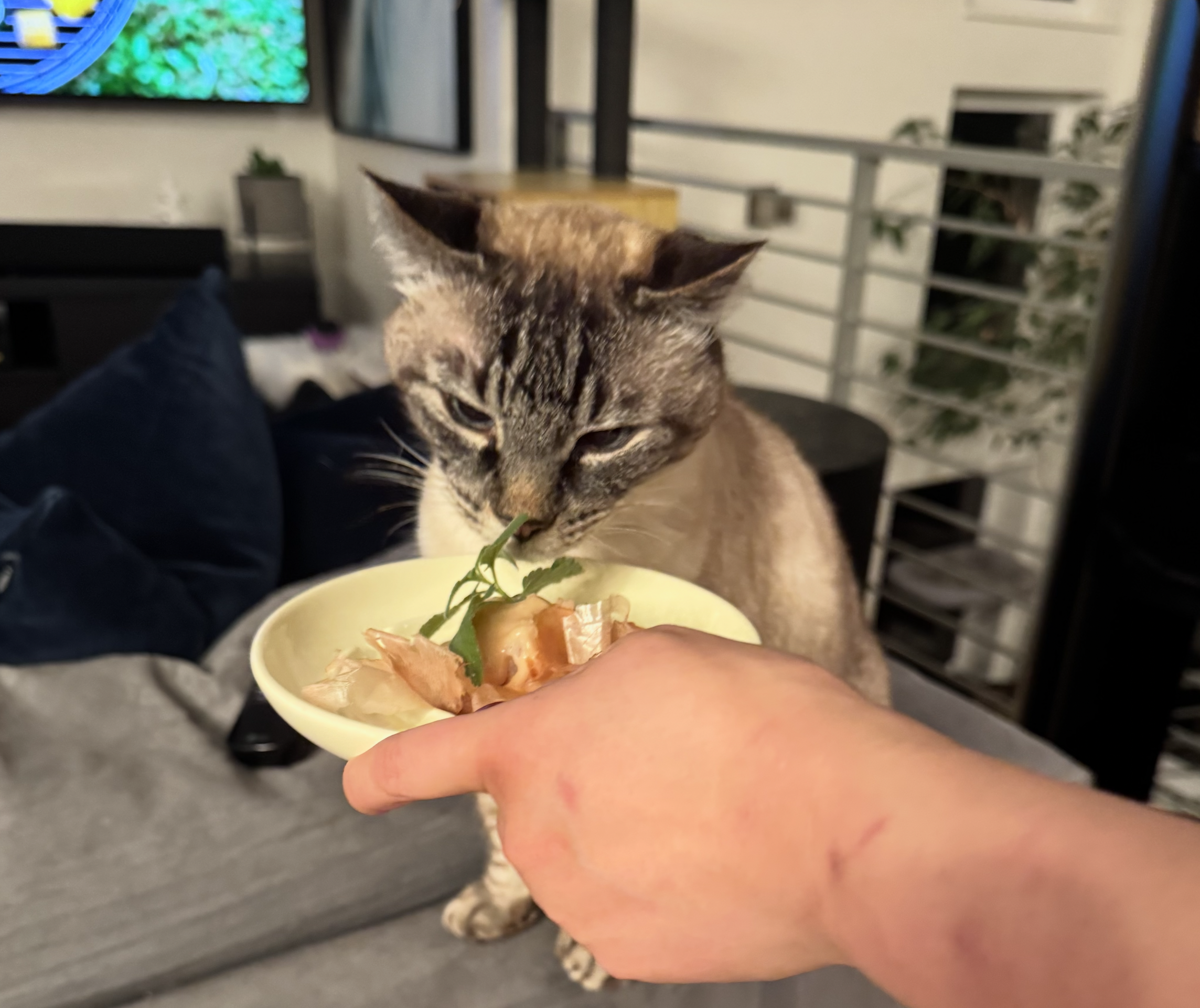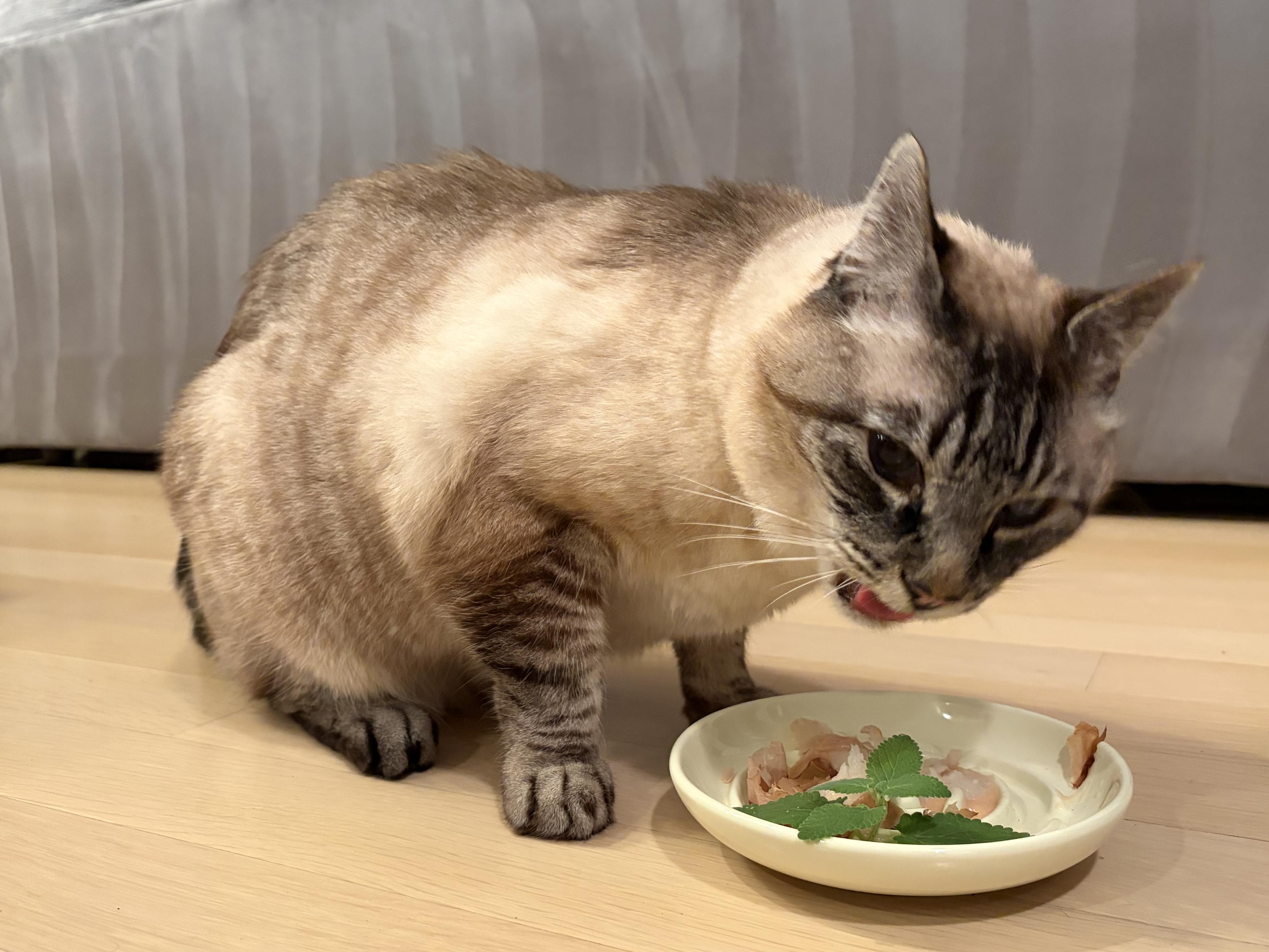 Max is celebrating his 17th birthday with a cake made of halibut burger frosted with churu and topped with bonito flakes and a sprig of fresh catmint
