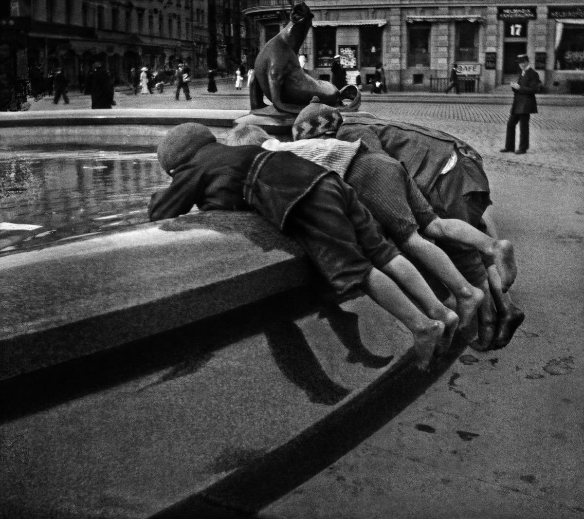 Lapsia leikkimässä Havis Amandan suihkulähteellä. (1910, Helsingin kaupunginmuseo)