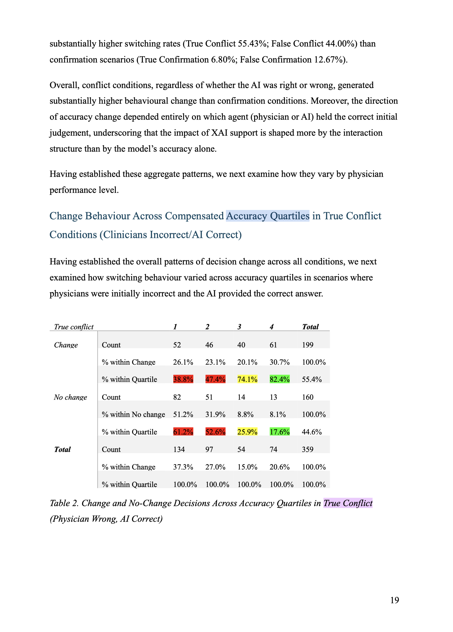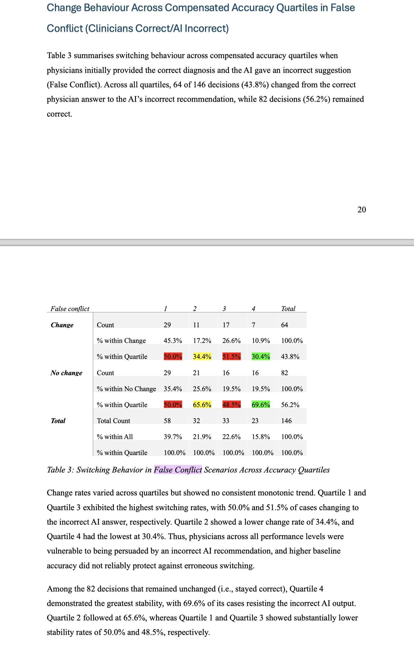 Across 4,905 unaided and AI-aided decisions, clinicians were more likely to revise when the AI disagreed than when it agreed — even when the AI was wrong!