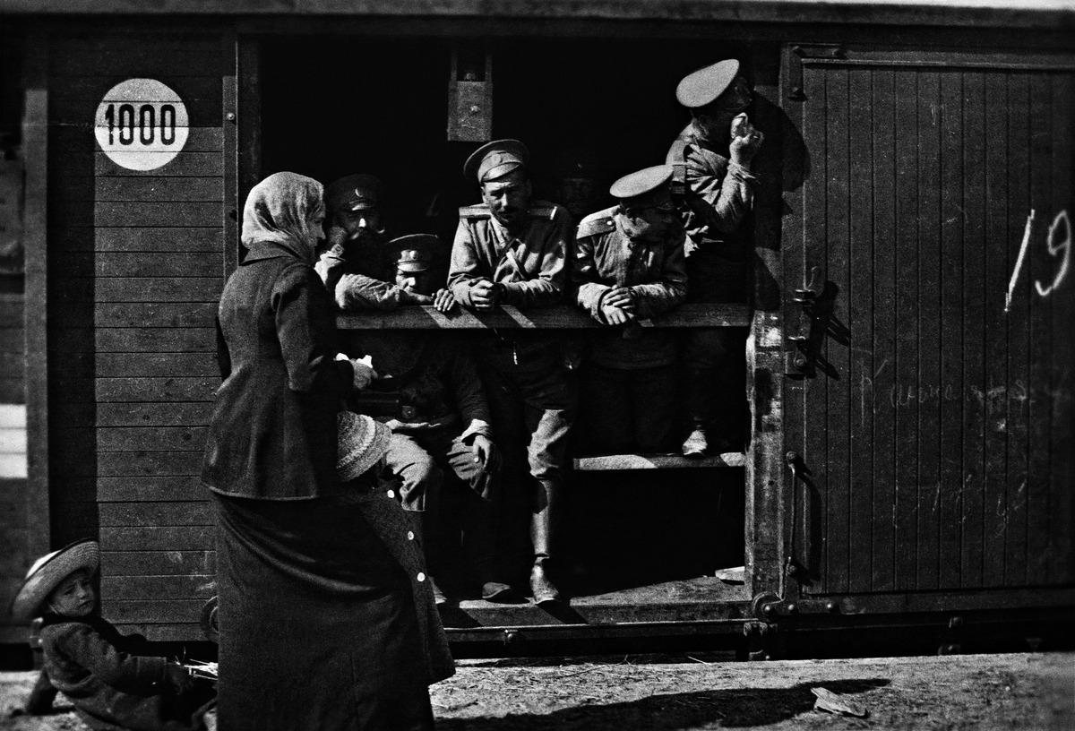 3. Ensimmäinen maailmansota, venäläisiä sotilaita junanvaunussa lähdössä sotaan Helsingistä.