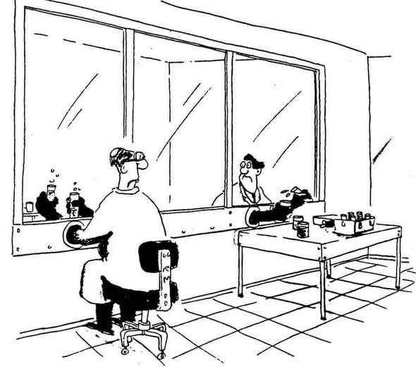 @AaronDavid #alt4u cartoon of two scientists doing work through those glass panels with gloves in them, meant to keep them completely isolated from the chemicals they're experimenting with. They look at each other in confusion and fear as they realize that they're sitting on each side of the glass, each exposed to the other's experiment
