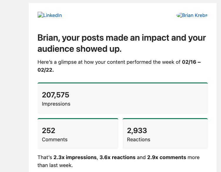 Lol, most of these impressions were on a post I made about why you maybe shouldn't verify your LinkedIn account.