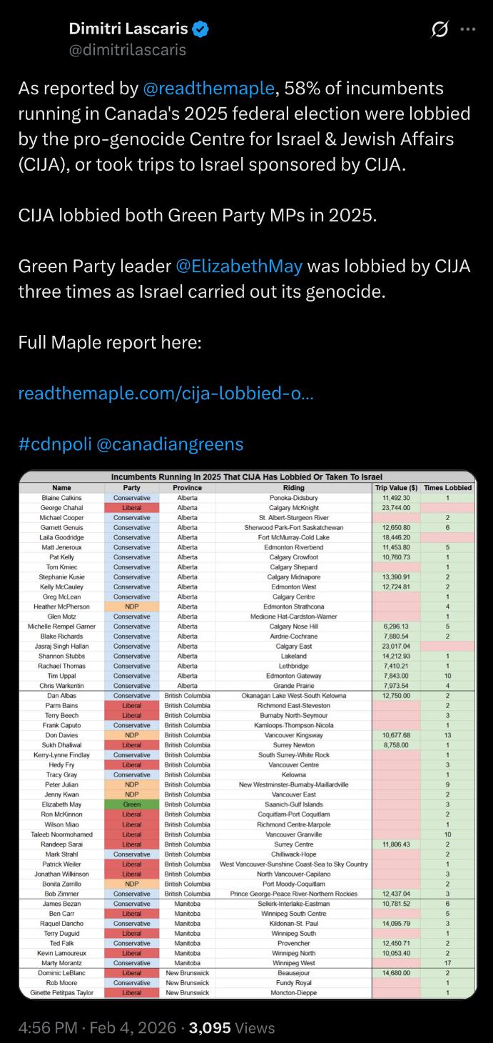 🇨🇦As reported by readthemaple, 58% of incumbents running in Canada's 2025 federal election were lobbied by the pro-genocide Centre for Israel & Jewish Affairs (CIJA), or took trips to Israel sponsored by CIJA.